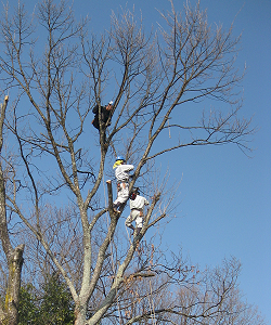 樹齢何十年、何百年もの木は、時代の流れと共に支障木あるいは危険木、枯損木と成りうる可能性があります。人間の生活のためには、長い歴史を見届けてきた巨木や御神木であったとしても伐採もしくは強剪定せざるを得なくなるものです。山の中で自由に倒せる木と違い、倒す事のできない木、いわゆる「吊り切り」せざるを得ない木は手間と熟練の技が必要となってきます。たとえば、お寺の本堂の屋根の上に枯れかけた巨木の枝が伸び、今のうちに対処しないと次来る台風等で本堂に多大な損害を与えてしまう事にもなりかねません。しかし、巨木の枝を切りたいと思っても、大き過ぎたり、クレーンなどの重機も入る事ができないと、すべて人力による作業になります。計算では答えが出ない難問を経験と技で解き、安全性を最優先しつつ、足場の悪い高所で時には風に煽られながらの作業をやりぬく。道行く人が足を止め、まるで何かのショーが始まるかのように釘付けに。決して華やかではないが、無事終えた時の達成感は、木から降り地面に足を着けた瞬間、緊張が解け喜びによる足の震えがくるのです!